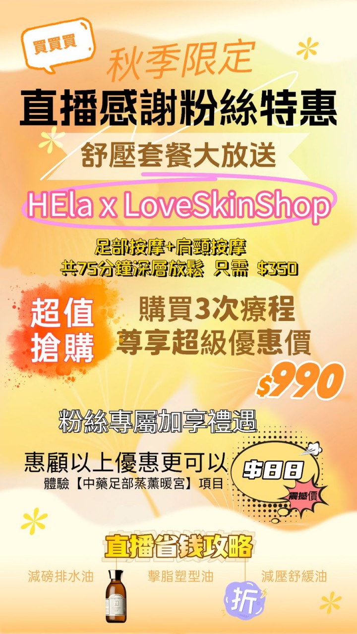 #閨蜜幫直播購物平台 #直播預告 #秋季限定 #超值優惠 #足部按摩 #肩頸按摩 #銅鑼灣好去處 #蘭芳道打卡 #西班牙按摩油優惠