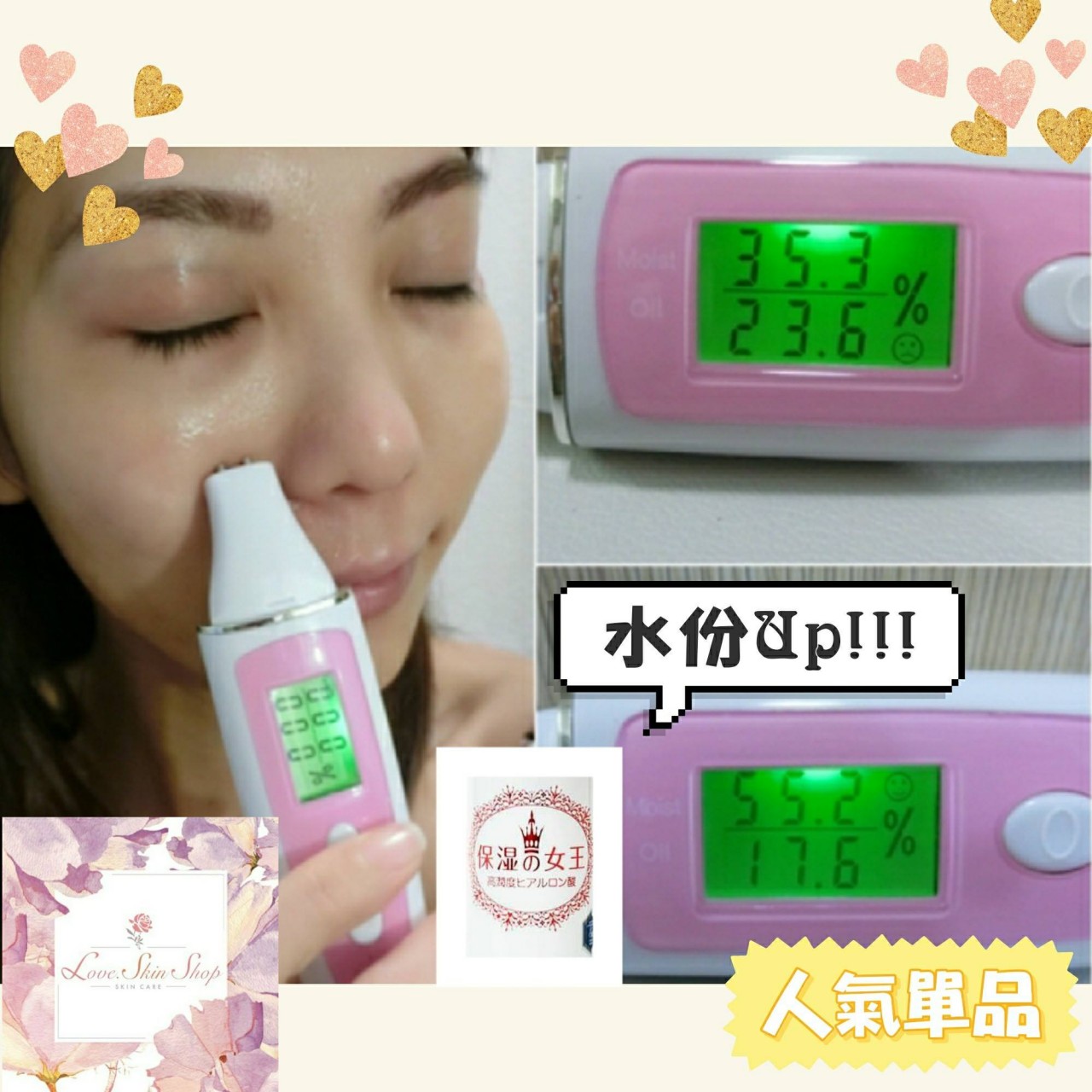 當使用後肌膚因擁有濃厚的玻尿酸,水份也提升了很多,而且更不受空氣中的濕度影響,可保持一定保濕度,當肌膚保濕度足夠,油份也會自然比較少了!