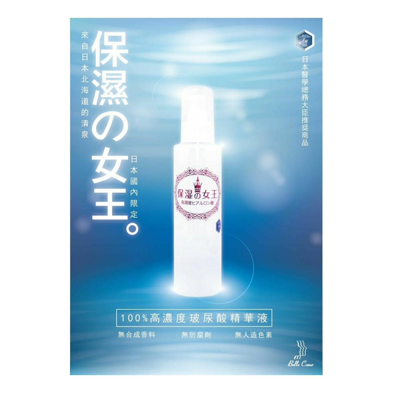 保濕之女王更榮獲日本醫學縂務大臣推薦產品,更沒有合成香料,無人做色素,無對羥基苯甲酸酯(防腐劑),而且玻尿酸(透明質酸)有非常強的保濕能力,只需1g 就可吸收 6 升的水,可有效提高保濕和改善皮膚的效果。