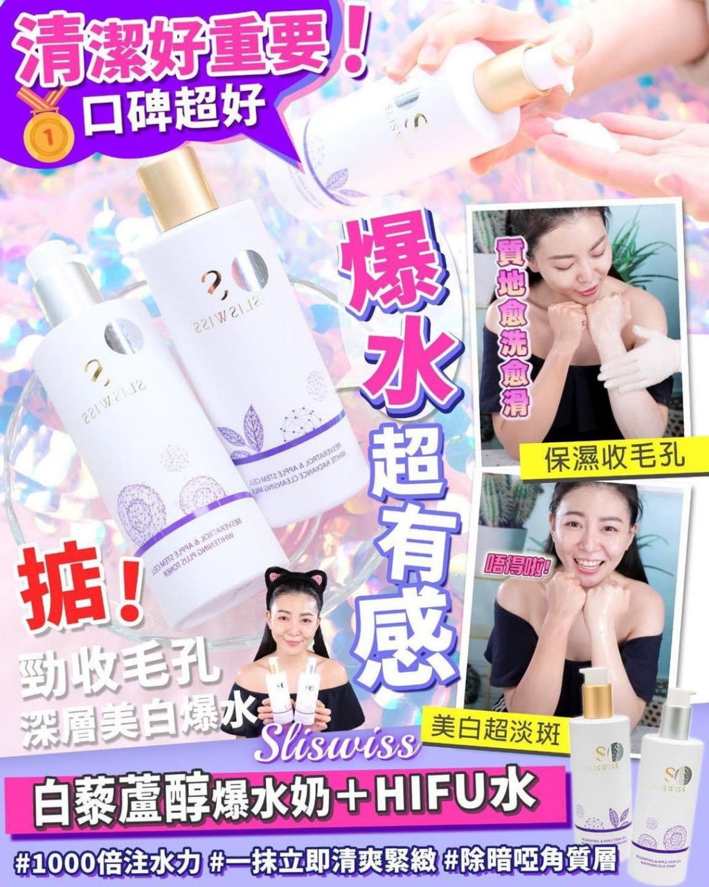 Sliswiss 新品率先登場 🎉🎉🎉 結合膠原 + 白藜蘆醇的心血結晶 💖 套裝包括 : 💧 SLISWISS 爆水洗面奶 300ml X1 💧 SLISWISS 爆水 HIFU 爽膚水 300ml X1 #SLISWISS 爆水 HIFU 洗面奶 300ml 洗一次面好似做咗十次深層清潔面膜 🧖🏻♀️ 用咗三日 已經睇到效果 ‼️‼️ 😱 減低 80% 暗粒 縮細咗 90% 毛孔 徹底...