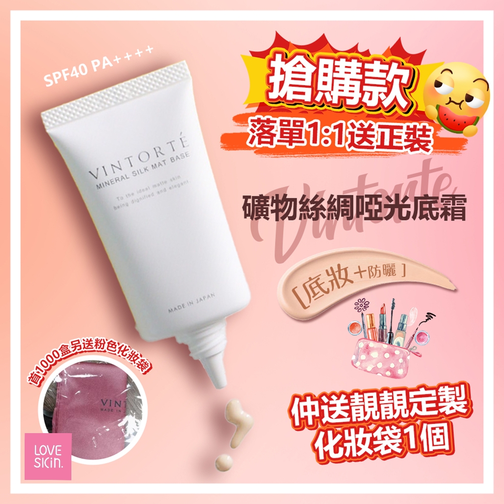 落單1:1送正裝 首1000盒另送粉色化妝袋 #搶購款 Vintorte 礦物絲綢啞光底霜 SPF40 PA++++ [ 底妝+防曬 ] 仲送靚靚定製化妝袋1個 親膚底妝系列,由天然礦物質和蠶絲精華配製而成,質地濕潤,妝效美麗。 不需要清潔劑,因為它是一種低過敏性配方,含有 9 種無添加劑成分。 它可以用濕面和溫水去除,因此皮膚敏感的人也可以使用。 *洗臉前務必用溫水預洗。 這是一款啞光底妝...