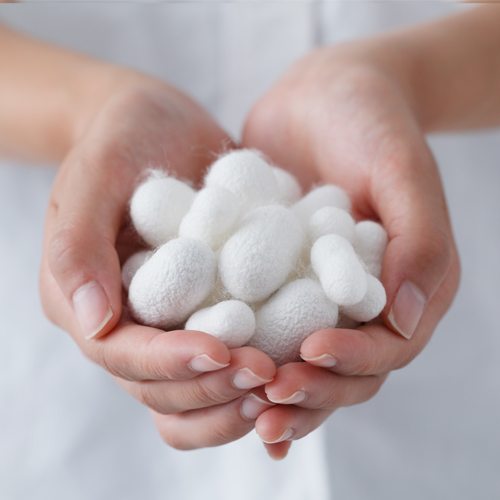 絲綢由蛋白質構成,蛋白質由與人體皮膚相同的18種胺基酸組成。眾所周知,它與人體皮膚非常相容。繭由多層纖維構成,可以保護蠶免受紫外線和外部因素的傷害,並保持適當的溫度和濕度。為了最大限度地發揮這種對皮膚的作用,我們使用奈米尺寸的奈米絲絲蛋白代替通常用作絲綢成分的水解絲。
