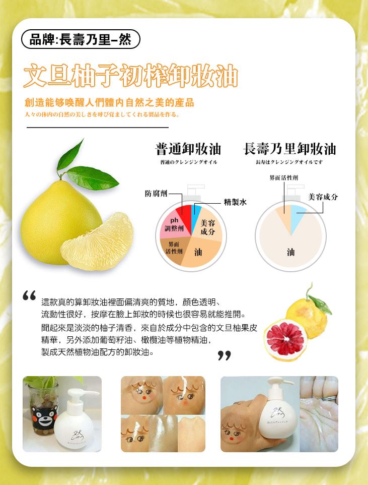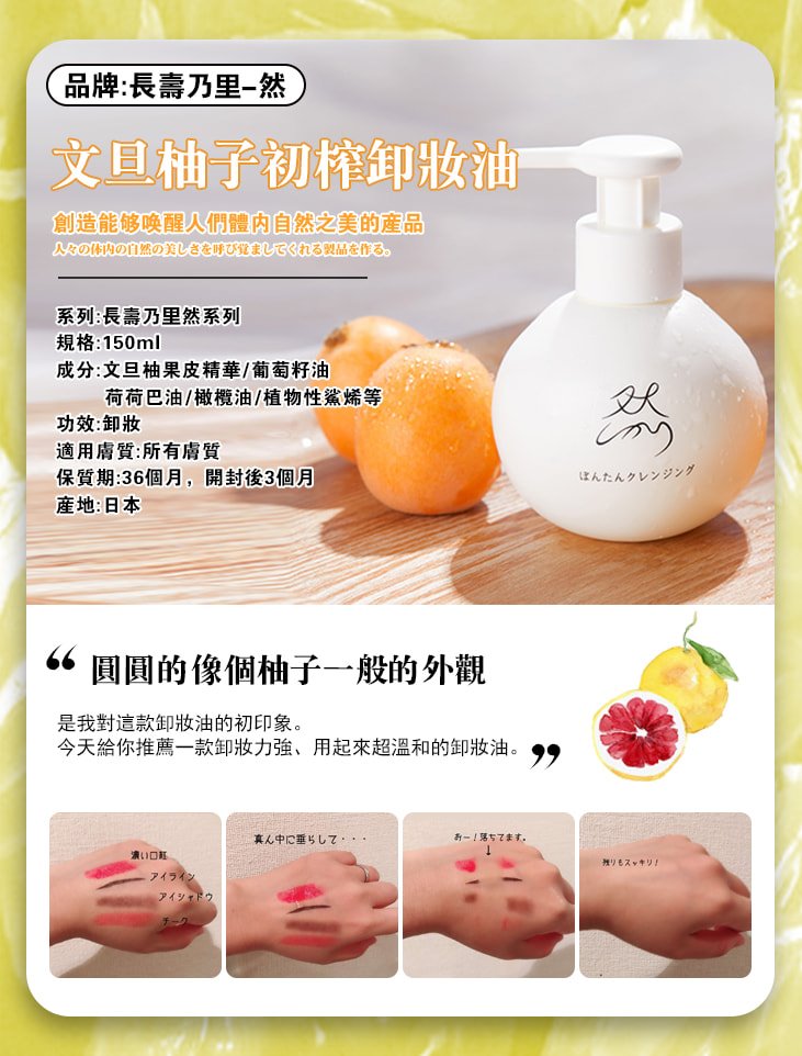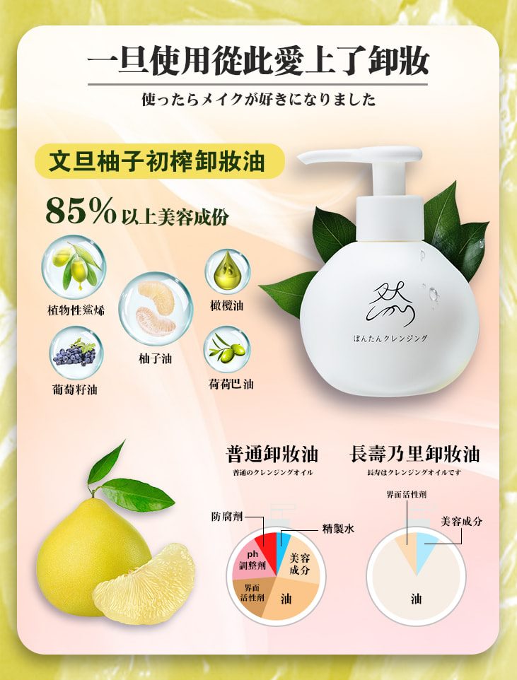 長壽乃裡每年二月會採用“初榨”的柚子作為原料,添加四種植物型美容油的,溫和滋潤肌膚的卸妝油同時是一支植物粹取的活性精油。