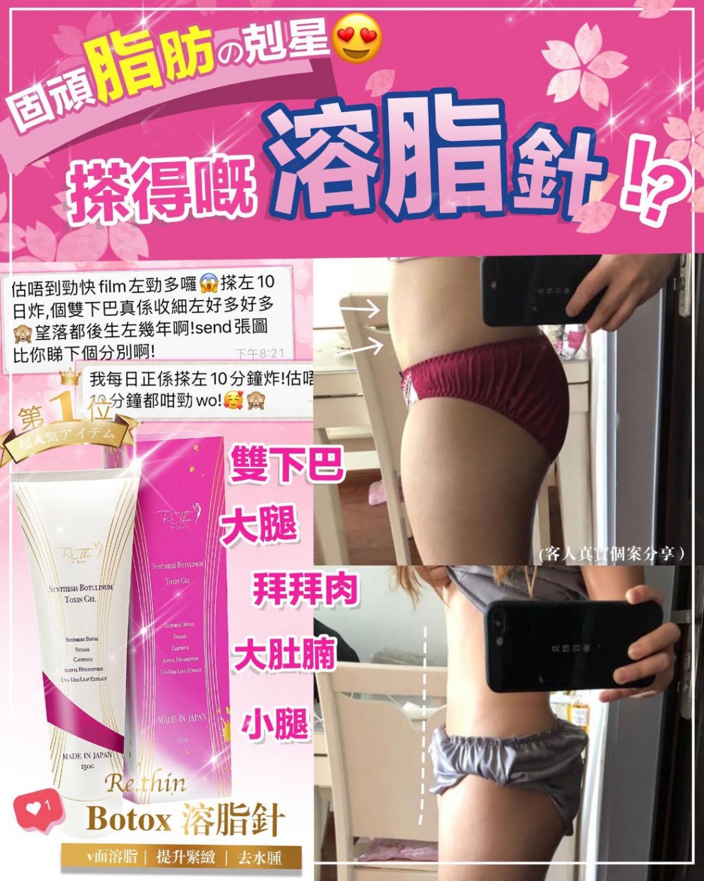日本 Rethin 魔鬼溶脂針 150g 《面、頸、肚、手腳,全身適用燃脂收緊 gel 》 Re.Thin 又有新野 ‼️‼️ 魔鬼溶脂針 踢走包包面雙下巴 💥 美魔女都愛用全效緊致啫喱 keep 住收緊 可以用喺面上嘅瘦身膏!用咗一次搽上面 10 分鐘咋,個雙下巴已經縮細咗成塊面都 feel 到係 firm 咗 ‼️ 一支塗抹式瘦身 gel 仲可以用埋喺面部,即係面腫或有雙下巴都用得呀 ‼...