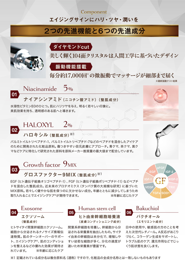▸ 6種強效抗老成分:菸鹼醯胺5%、Haloxyl2%、9種生長因子、外泌體、幹細胞培養液、補骨脂酚