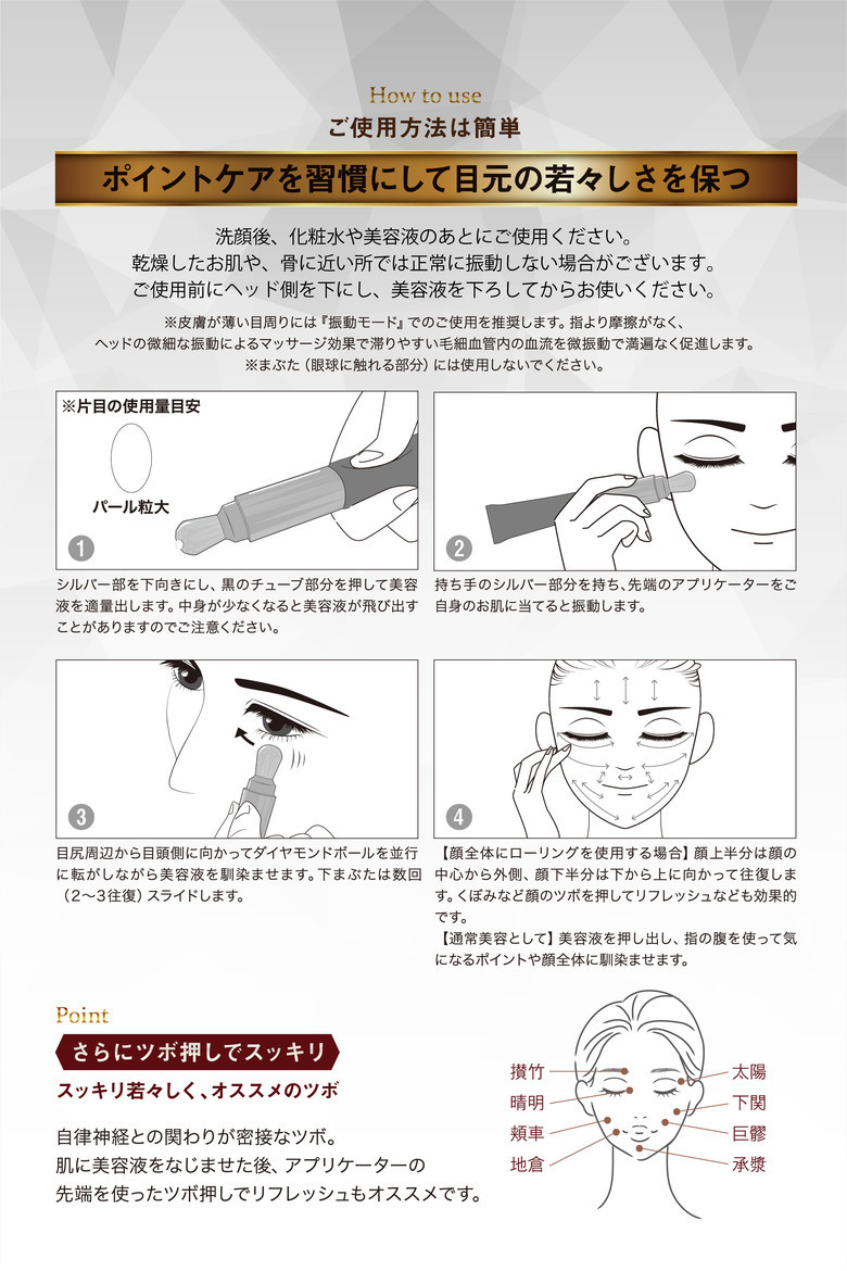 ▸ 104面鑽石切割按摩頭,17,000次/分鐘微振動,促進循環與吸收