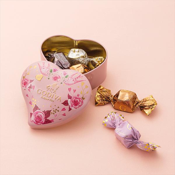 描繪帶來幸福的小鳥和可愛花朵的心形罐子裡裝滿了 G-Cube 巧克力,這是一種由白色、牛奶、深色和情人節製成的新牛奶草莓慕斯。