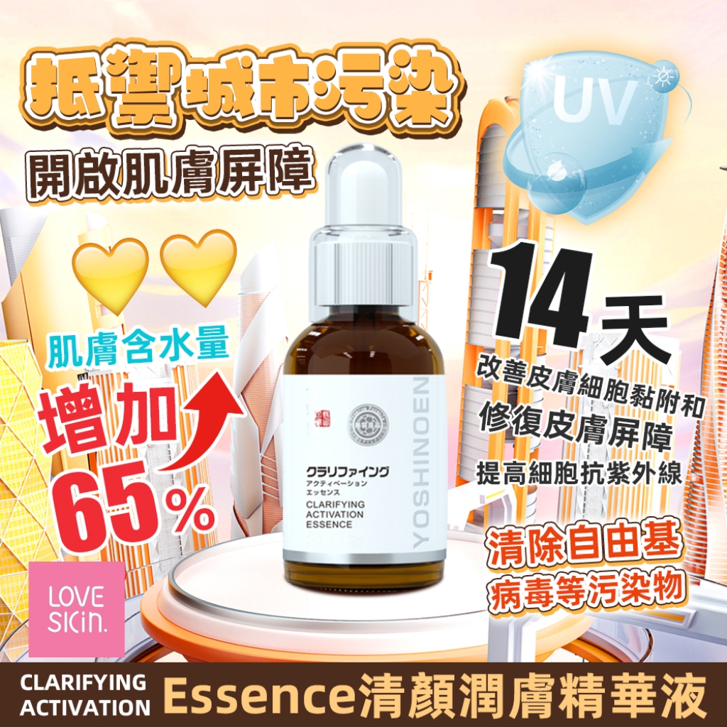吉野園Clarifing Activation Essence 清顏潤膚精華液 60ml 都市抗污染,人氣小滴瓶 污染長年累月堆積,使得肌膚加速老化。 吉野園專利號*抗氧化抗污染配方成分可以使肌膚含水量增加65%,開啟皮膚屏障,還你光透肌。 加入日本沖繩深層海藻超高純度萃取精粹,不加一滴水的濃縮精華! 全方位防護膜開啟,減少PM2.5的入侵傷害,清除高達99.8%光源環境對肌膚的老化加速...