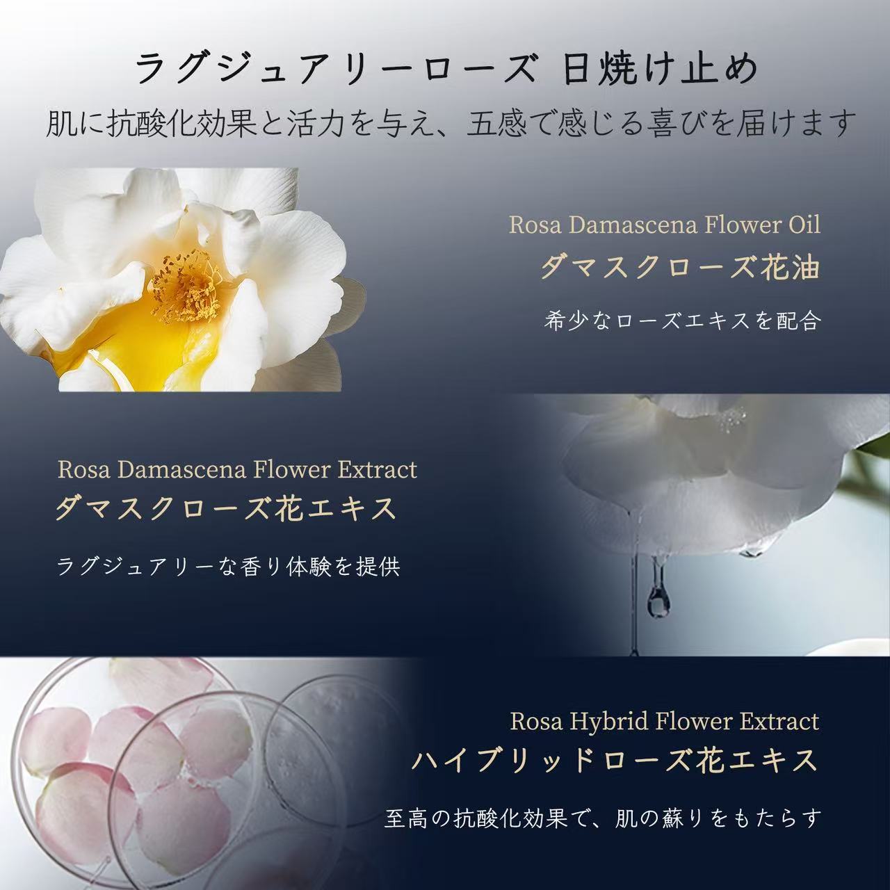 · 三大玫瑰精華養膚:突厥薔薇花油、雜交玫瑰花提取物、突厥薔薇花提取物,防曬同時滋養肌膚