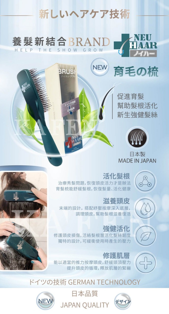 NEU HAAR 日本品質育毛梳活髮刷 ・活化髮根、滋養頭皮 ・強健活化、修護肌層 ・發揮極致按摩功效 ・加速生髮水的滲透:深層滲透,迅速發揮效能 ・促進血液循環:提升頭皮血液循環,增強髮根營養供應 ・緩解脫髮問題:有效減少脫髮,恢復濃密秀髮 擺脫脫髮困擾,擁有豐盈髮絲的理想選擇! 修護頭皮損傷,活絡髮根層活化髮絲韌度,獨特的設計,可緩衝使用時產生的壓力,能以適當的推力按摩頭皮,舒緩頭頂壓...
